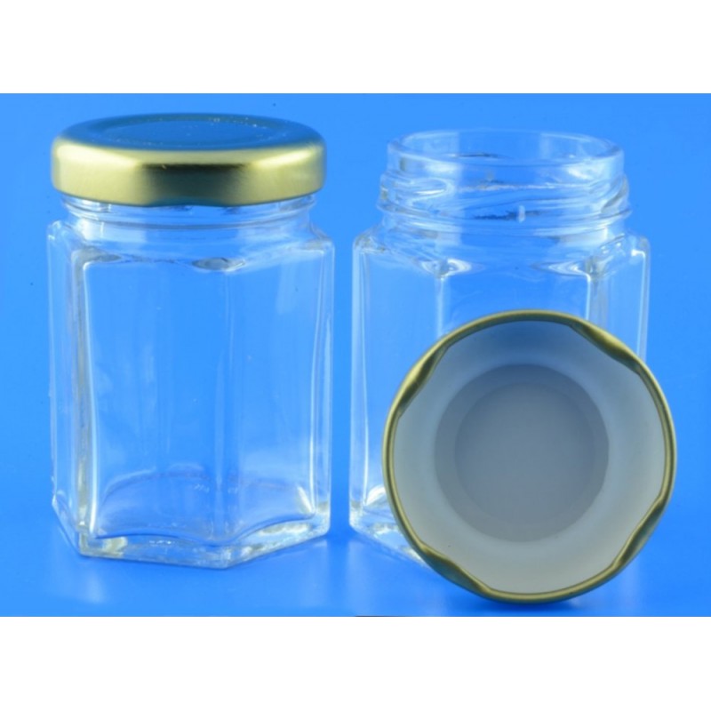 70 only 55ml Hexagonal glass jars for jams and chutneys with 43mm gold twist top lid. This is a full box.